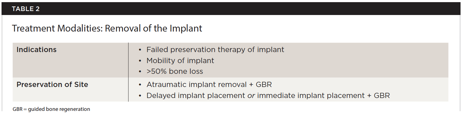 If implant mobility is evident, an atraumatic approach (preferably countertorque or counterscrew technique)36,37 is the only treatment option. After implant removal, if sufficient bone remains to achieve good implant stability and the decontamination of the site is thorough, immediate wide-diameter implant placement can be performed. However, if sufficient bone is not present, treatment must comprise GBR followed by delayed implant placement.