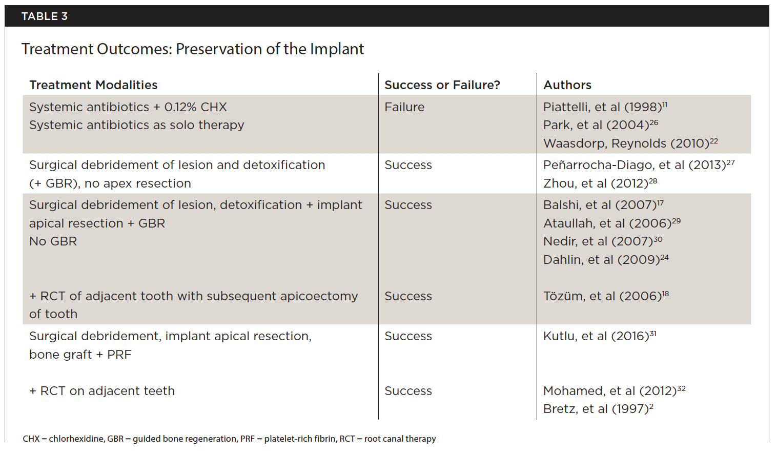 Open-flap with apical implant resection and degranulation, with or without defect management, with or without root canal therapy/apicoectomy of adjacent teeth. Other reports have suggested resecting the implant apex in cases in which total removal of granulation tissue is not assured, and when the maxillary sinus or nasal cavity is involved.1,17,24 Tözüm et al even performed root canal retreatment or periapical surgery if the adjacent tooth was endodontically treated (Table 3).18 If the lesion is secondary to a primary endodontic lesion from an adjacent tooth, endodontic management of the offending tooth should be performed. This should be followed up for several months. Closed periapical implant lesions have high healing potential and demonstrate complete resolution of periapical lesion. If resolution occurs, the patient should continue to be monitored. If the lesion shows no sign of resolution or shows signs of progressing, it should at this point be managed as a primary apical implant lesion.20