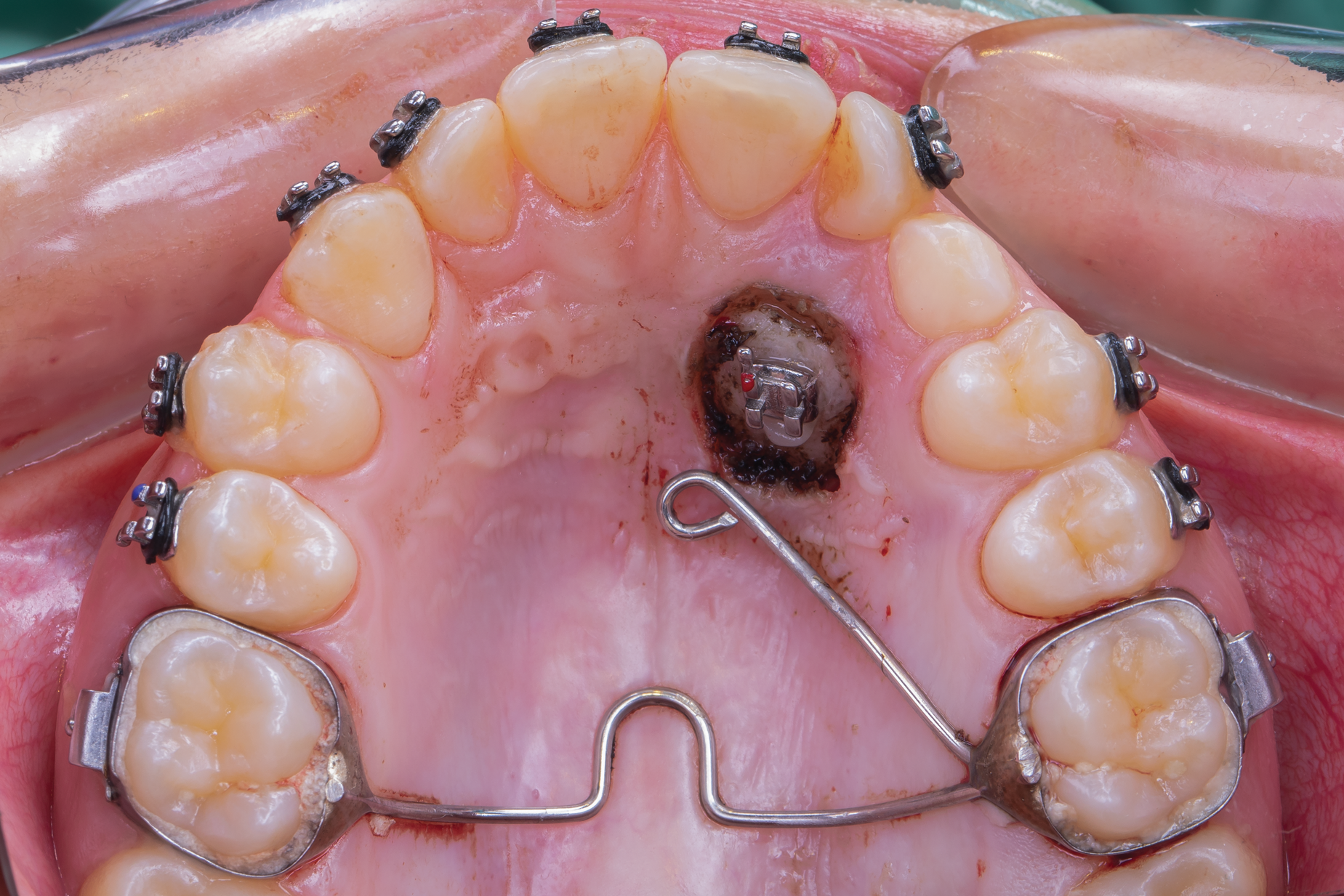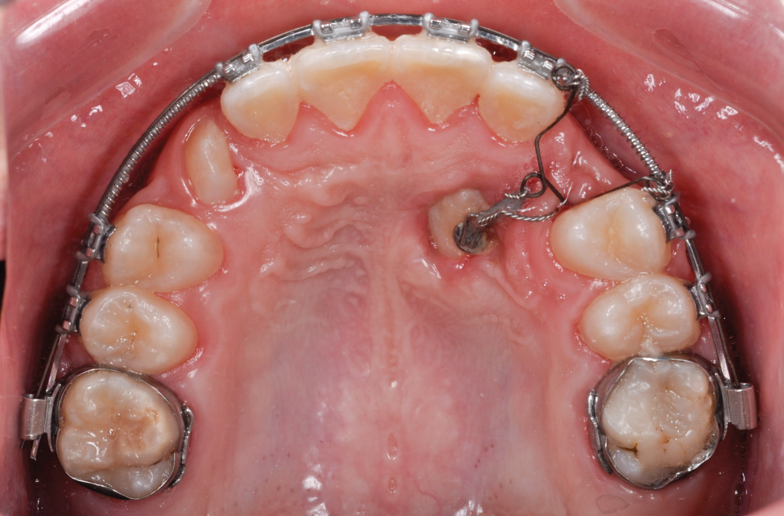 Various external elements, such as swinging gates, transpalatal arches, Hass expanders, quad helixes, Hyrax expanders, and temporary anchorage devices (TADs), have been used as alternative anchorage apparatuses. In the case of a transpalatal bar, the objective is to use cantilever extension arms to traction the impacted canine into the palate. This is followed by traction of the canine into its final position using positioning springs or other methods to bring the impacted tooth into the dental arch (Figure 4 and Figure 5).