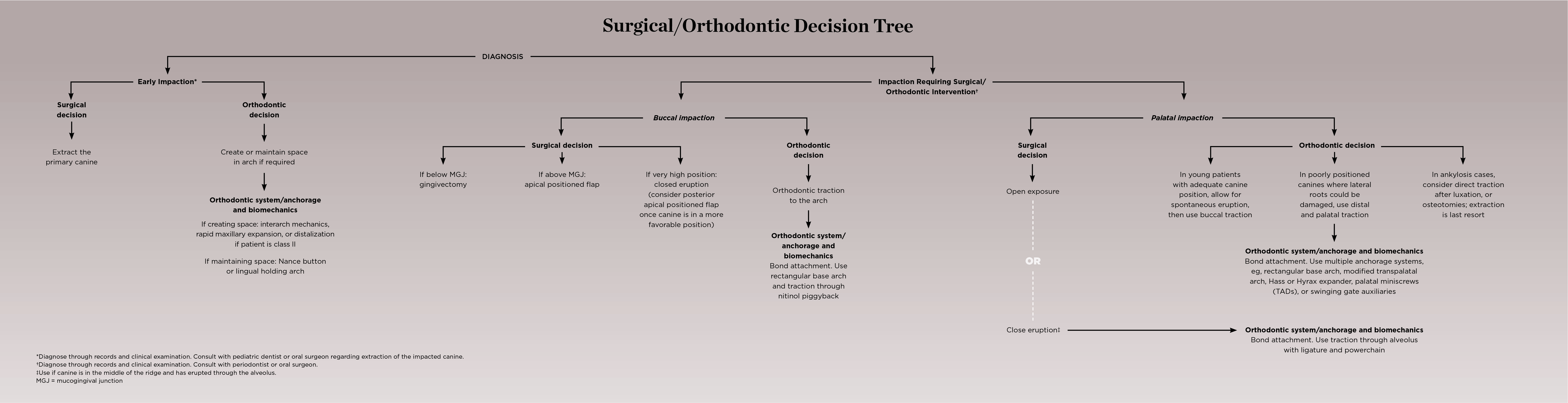 To assist clinicians in determining the optimal treatment of an impacted maxillary canine, a surgical/orthodontic decision tree is presented in Figure 1.