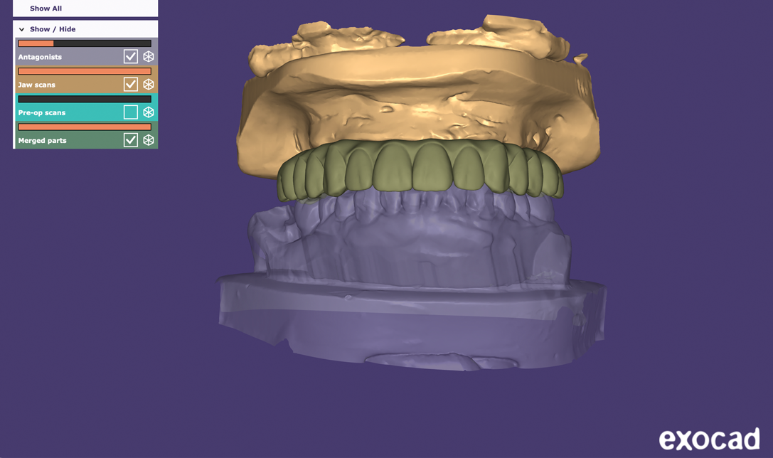 The final prosthetic was evaluated using a case check 3D viewer tool (Figure 14). After 2 weeks a final prosthesis was delivered (Figure 15 and Figure 16). At a follow-up visit the patient recorded proper occlusion, excursive movements, and comfort with the new prosthetics.