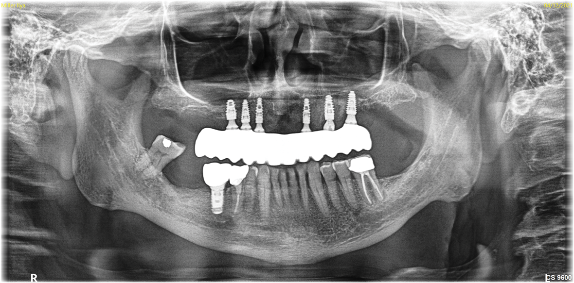 After 7 weeks the ISQ values were retested and substantial increases in values of 83 and 82, respectively, were noted. The patient's existing denture was used for a traditional conversion, which was accomplished utilizing multi-unit abutments and temporary cylinders while attempting to maintain the patient's current vertical dimension of occlusion (VDO). Approximately 3 weeks were allotted for the patient to adjust to his new fixed provisional. After determining that VDO, phonetics, and comfort were acceptable to the patient, the process for a final prothesis was initiated.