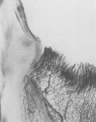 It has been established that the critical vascular supply to the periodontium and supportive alveolar bone is threefold22,23: (1) within the periosteum of the alveolar bone (Figure 1); (2) within the cancellous portion of the alveolar bone proper (Figure 1 and Figure 2); and (3) a vascular plexus within the PDL itself (Figure 2 and Figure 3). This further clarifies the fact that not only does the periodontal functional unit have components that are interdependent to each other, but critical vascular supply to the alveolar bone is composed of three unique units.